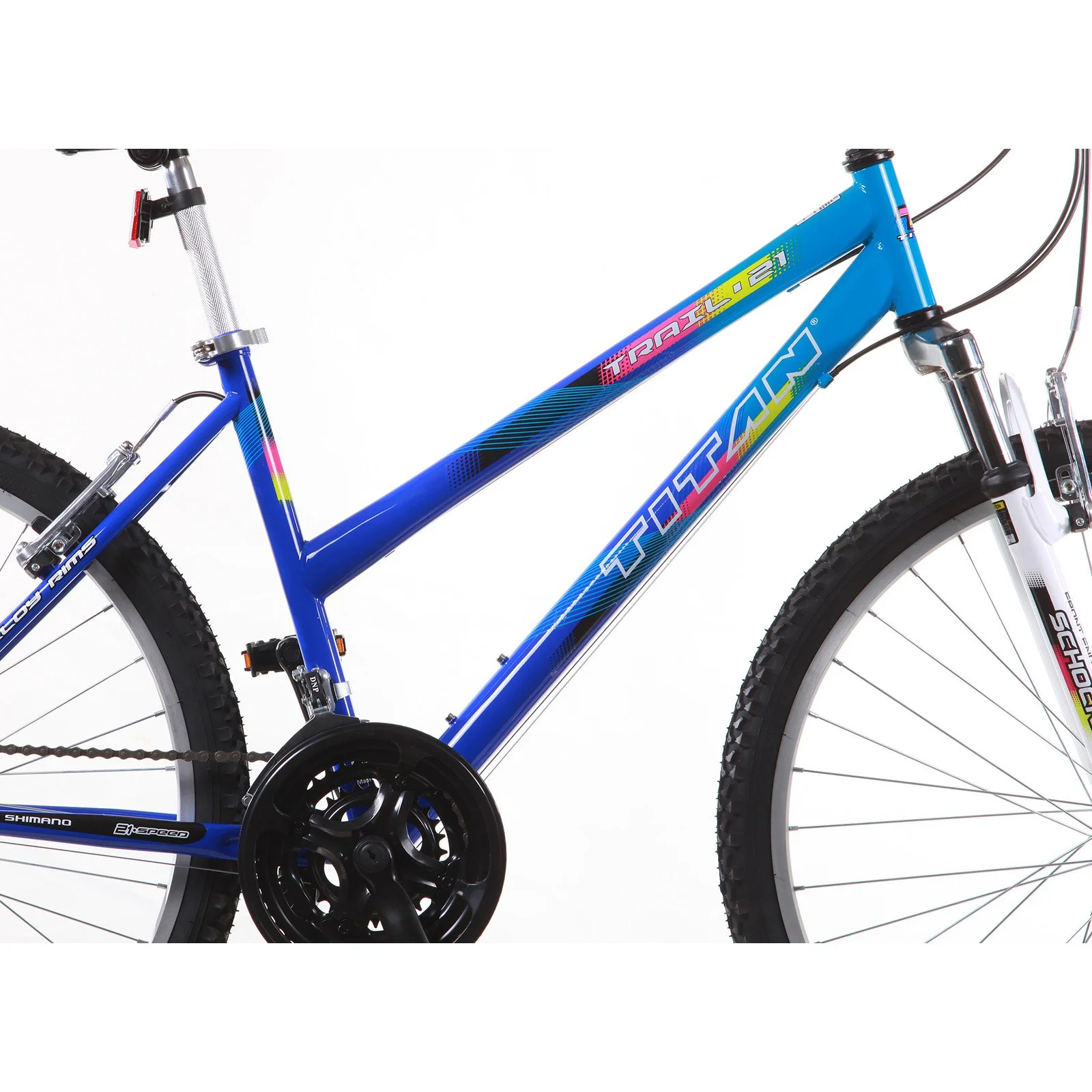 Mountainbike mit Hi-Ten-Stahlrahmen und Zoom-Federgabel. Ausgestattet mit 26-Zoll-Aluminiumfelgen und -naben, Mountainbike-Reifen, Aluminium-Sattelstütze, verstellbarer Sattel- und Lenkerhöhe, V-Bremsen vorne und hinten sowie einer 21-Gang-Shimano-Tourney-TX-SIS-Schaltung.