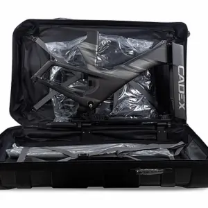 The base bar and extensions are designed to fold down easily into a compact size that can be loaded into the travel case without having to disassemble the parts. The travel case is made with a sturdy polycarbonate shell that provides high-impact strength and protection. It has wheels to make airport travel easier and complies with airline luggage restrictions.