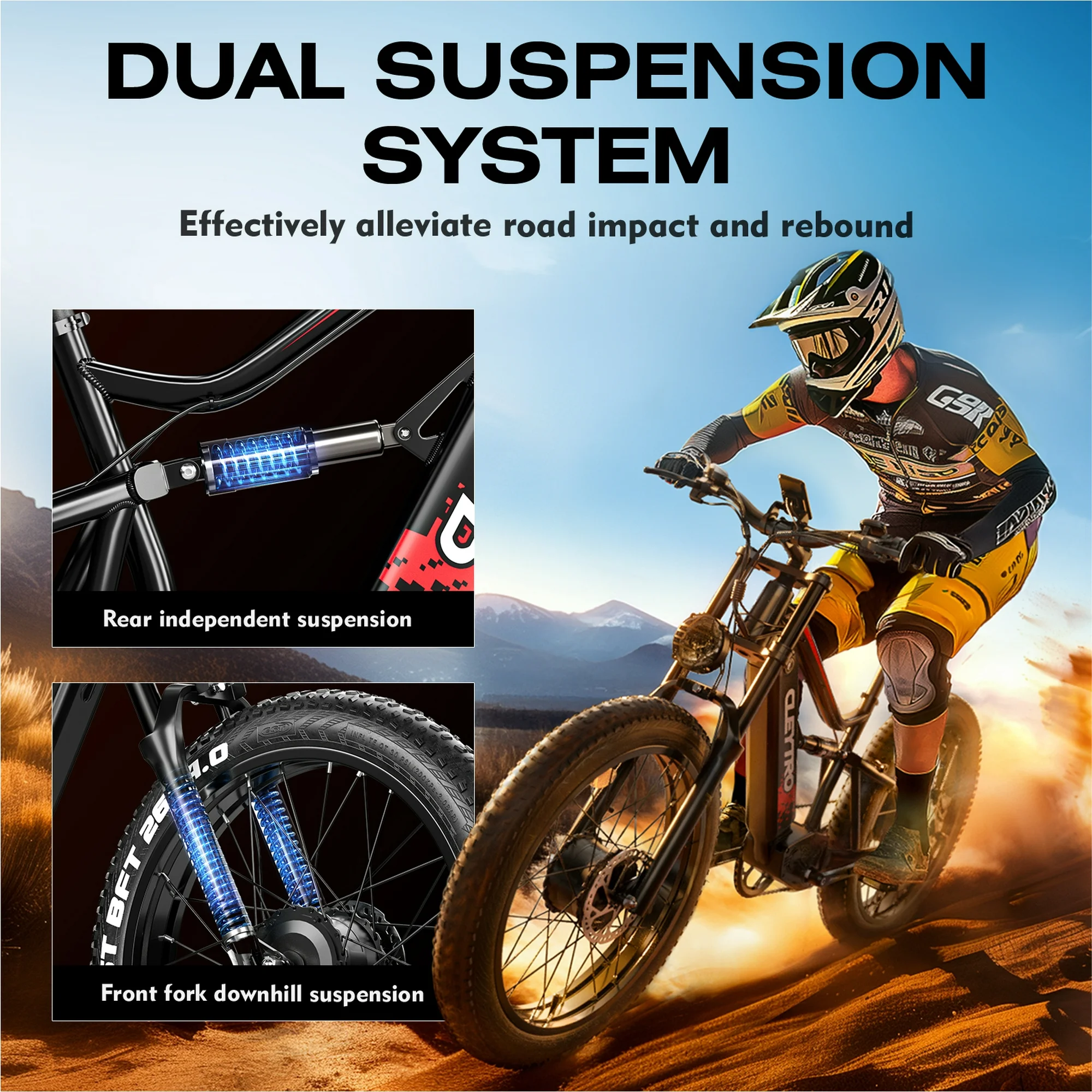 - 💎【Full Suspension System】Mountain electric bicycles have front and rear shock absorbers, which provide a smooth shock absorption effect during riding and effectively alleviate the impact and rebound of the road surface. You can enjoy a smoother ride on various complex terrains.