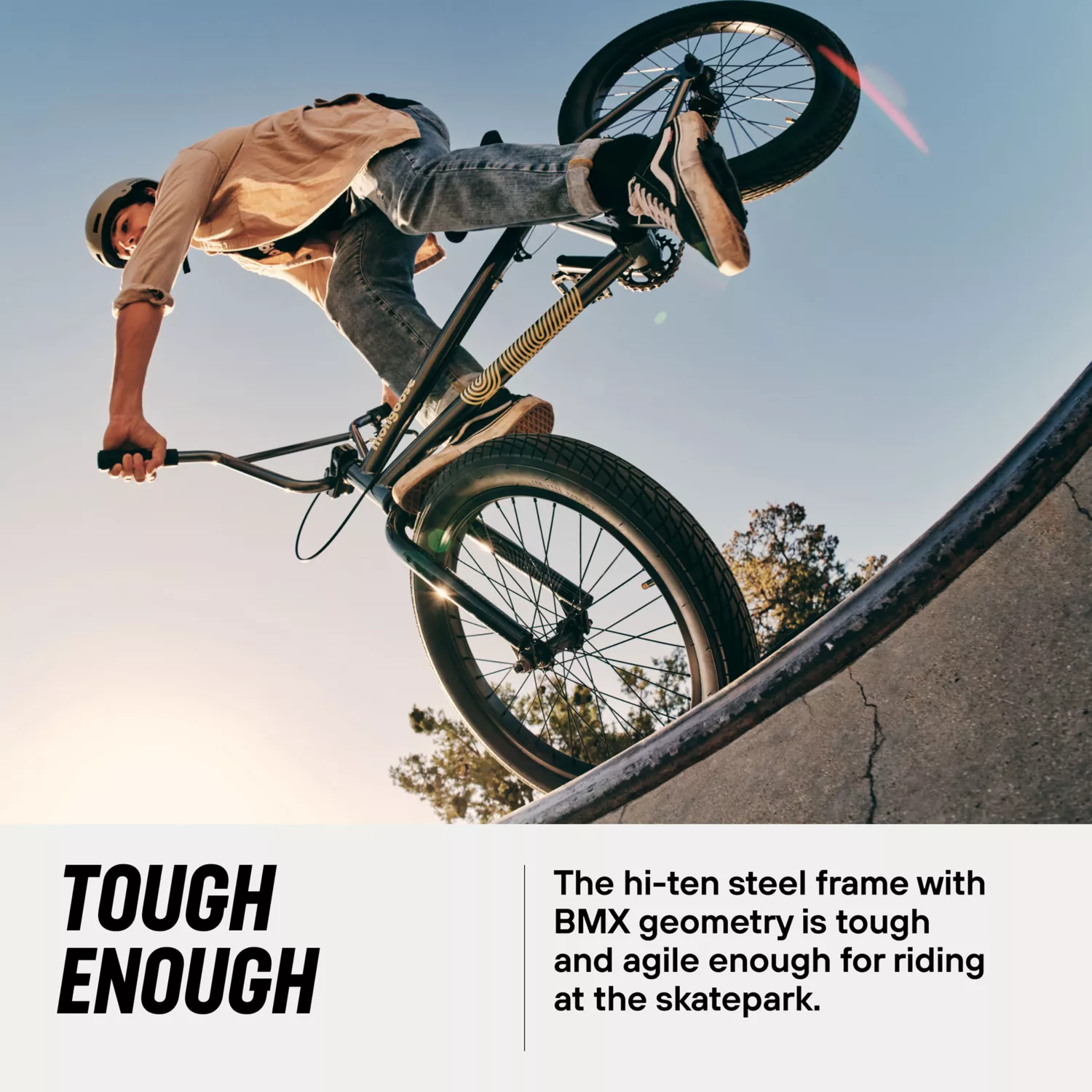 Der robuste und agile Hi-Ten-Stahlrahmen mit BMX-Geometrie eignet sich perfekt für den Skatepark.