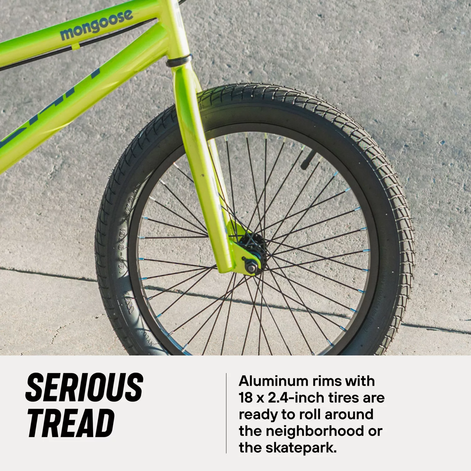 • Aluminum rims with 18 x 2.3-inch tires are ready to roll around the neighborhood or the skatepark