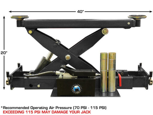 The Atlas® RJ8000 air/hydraulic rolling jack has telescoping arms that can be extended over the runways of a four post lift. The lift pads at the end of these arms can be positioned under the lifting points that are located over the runways of that four post lift. This rolling jack is equipped with expandable rail supports which adjust to fit between the runways of many different four post above ground lifts. These supports have a unique roller system that allows the rolling hydraulic jack to glide easily under the entire length of the vehicle.