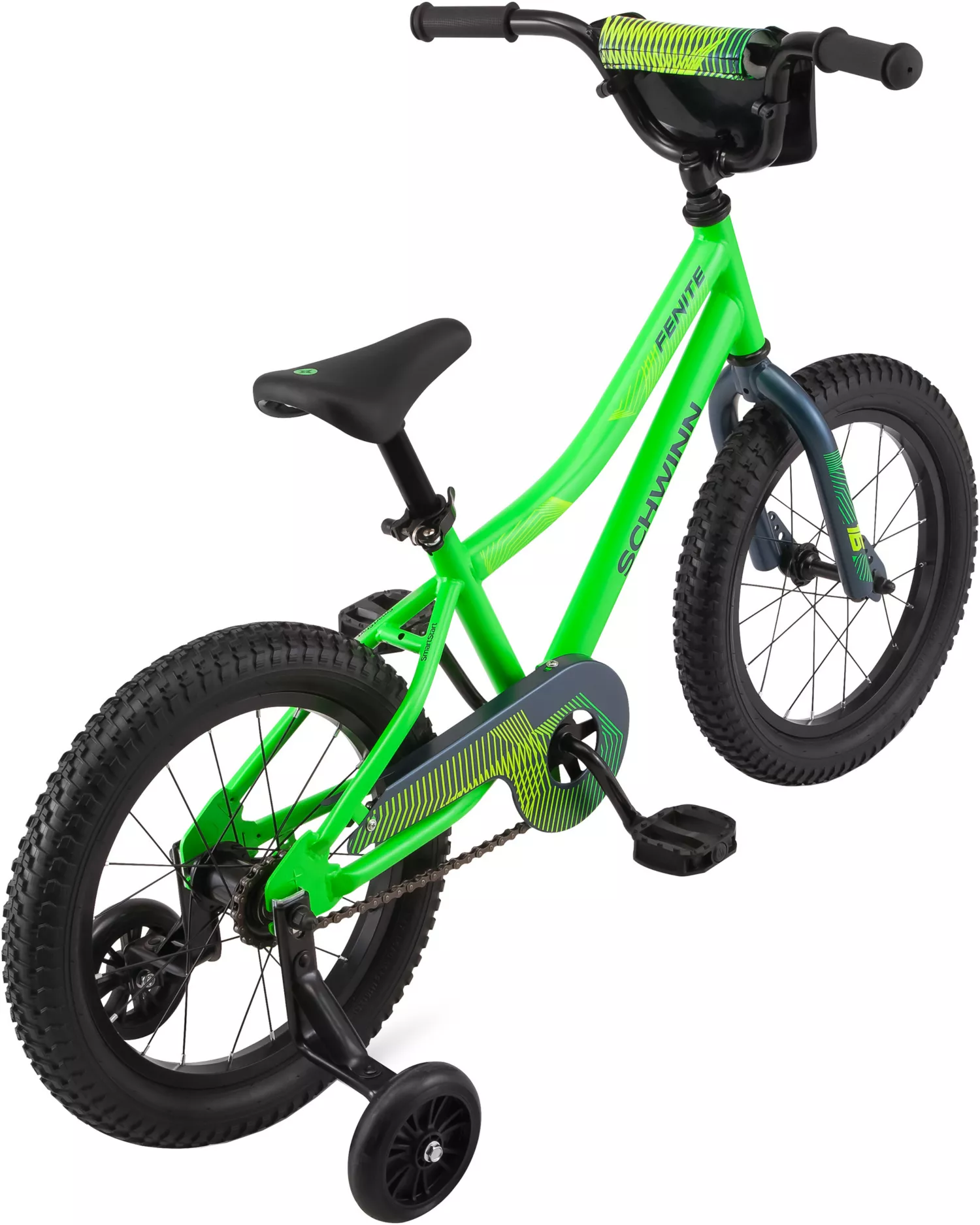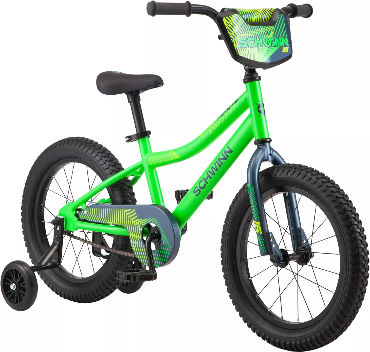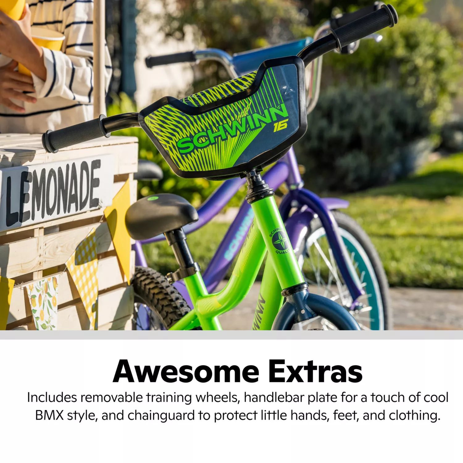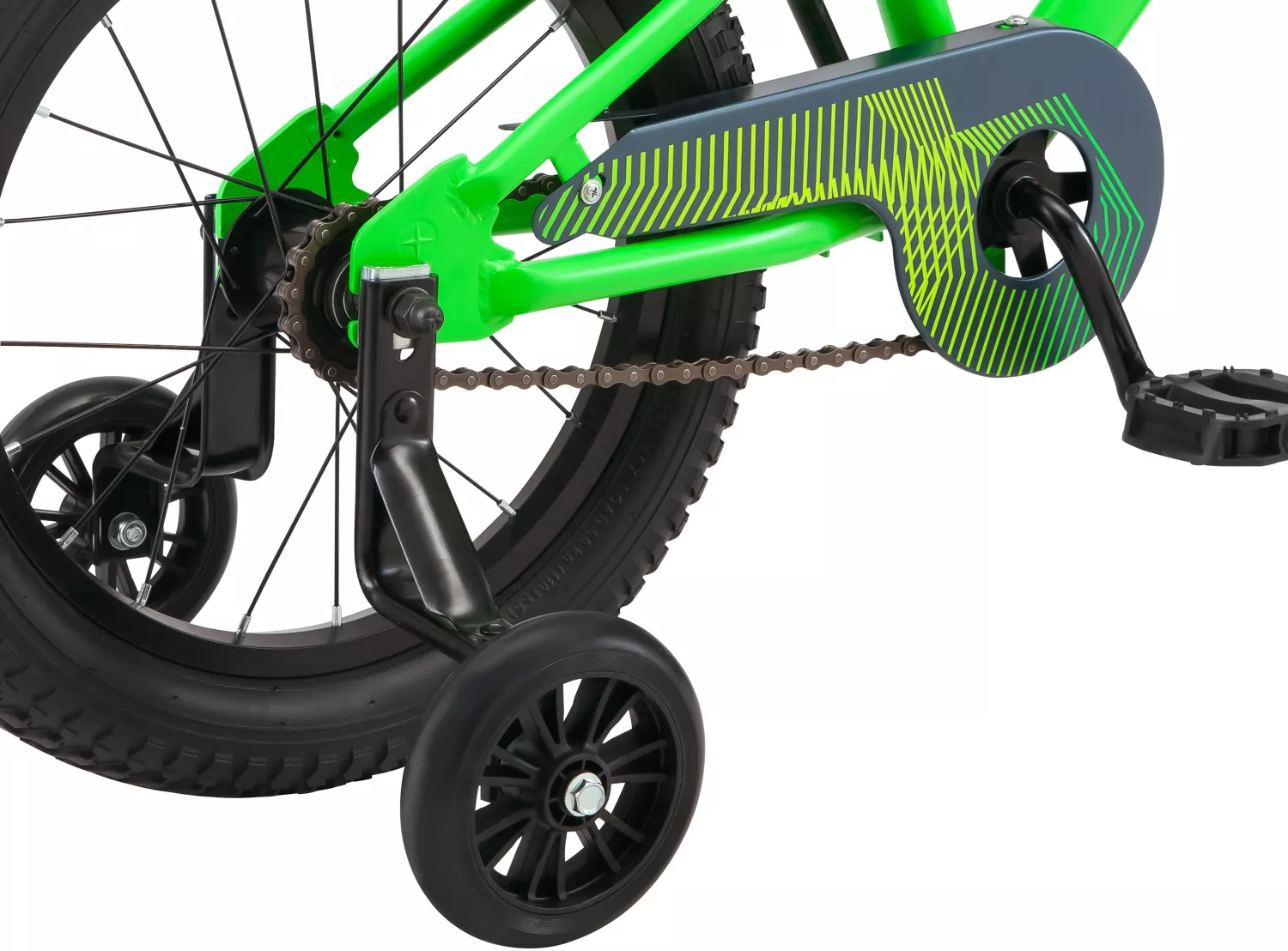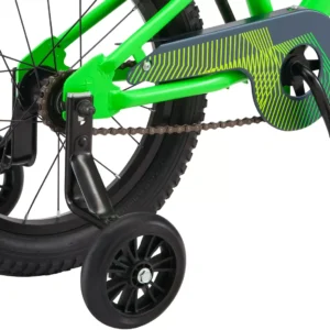 Abnehmbare Stützräder und eine Lenkerplatte verleihen dem Fahrrad einen Hauch von BMX-Stil.